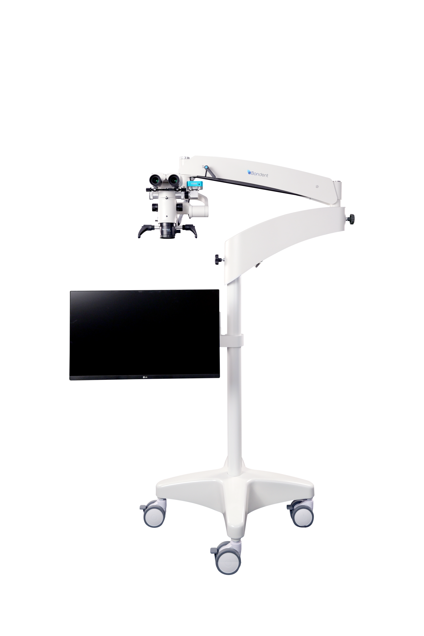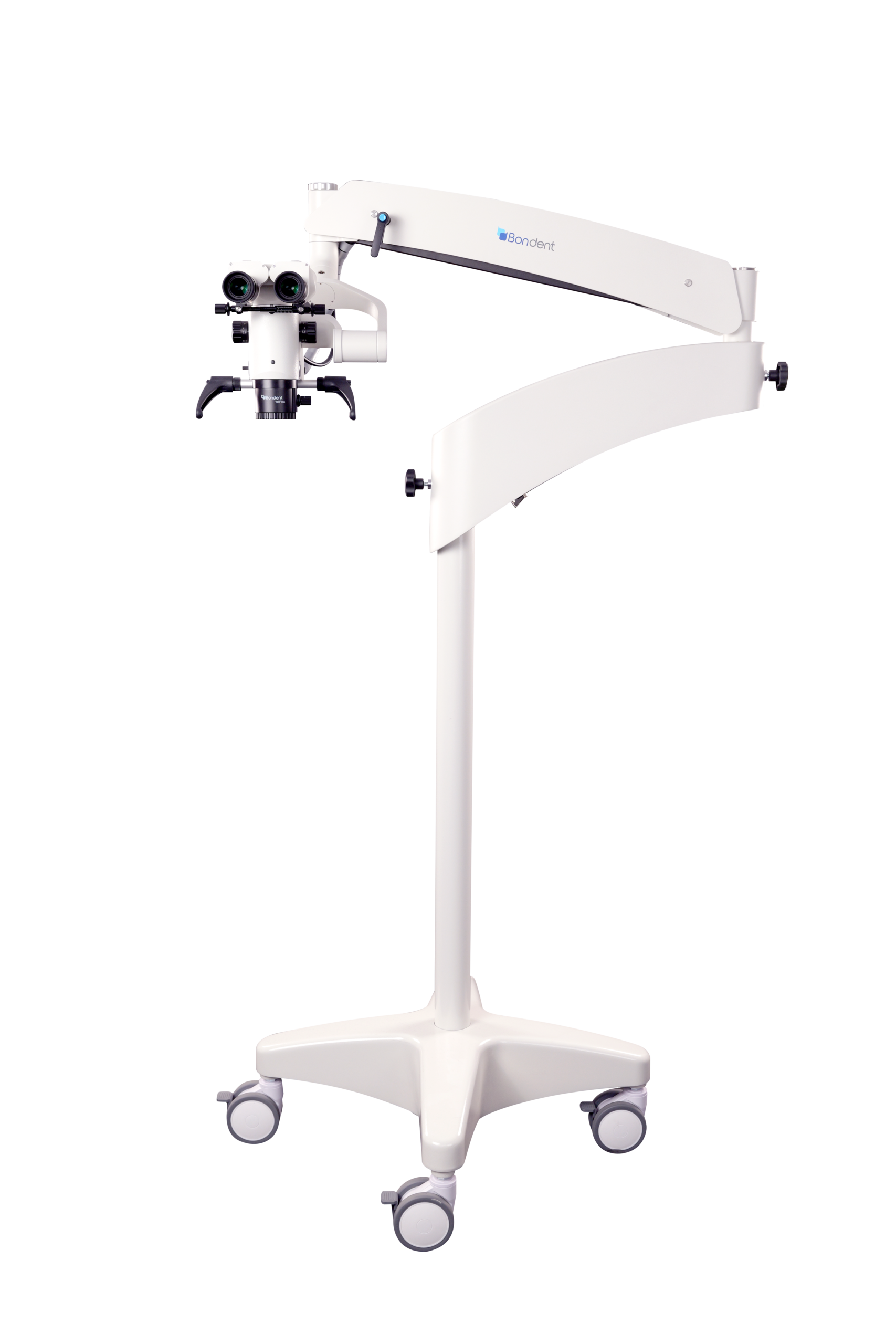 Tubo binocular inclinável 0° a 210°, braços com amplo alcance, base móvel com rodízios e ajustes de balanceamento